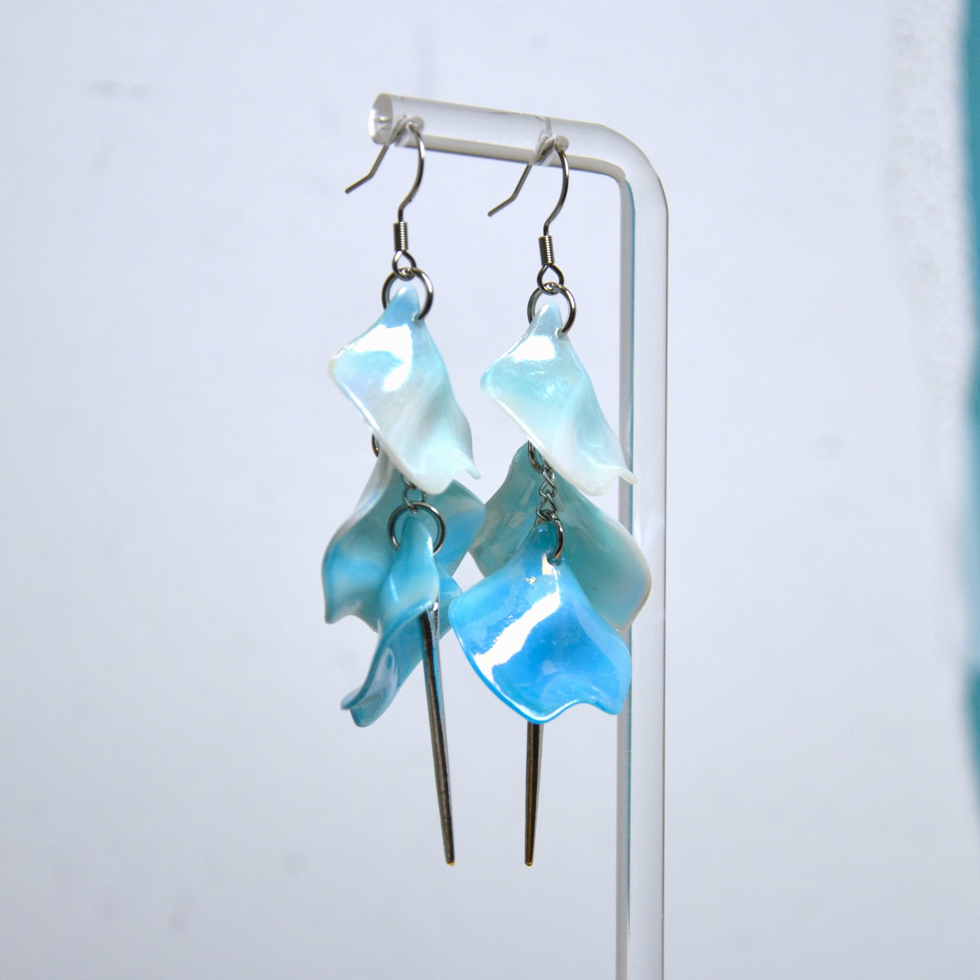 Des boucles d'oreilles à la fois originales et élégantes, composées de trois pétales marbrés blanc et bleu, suspendus à une chaîne et terminées par une aiguille.