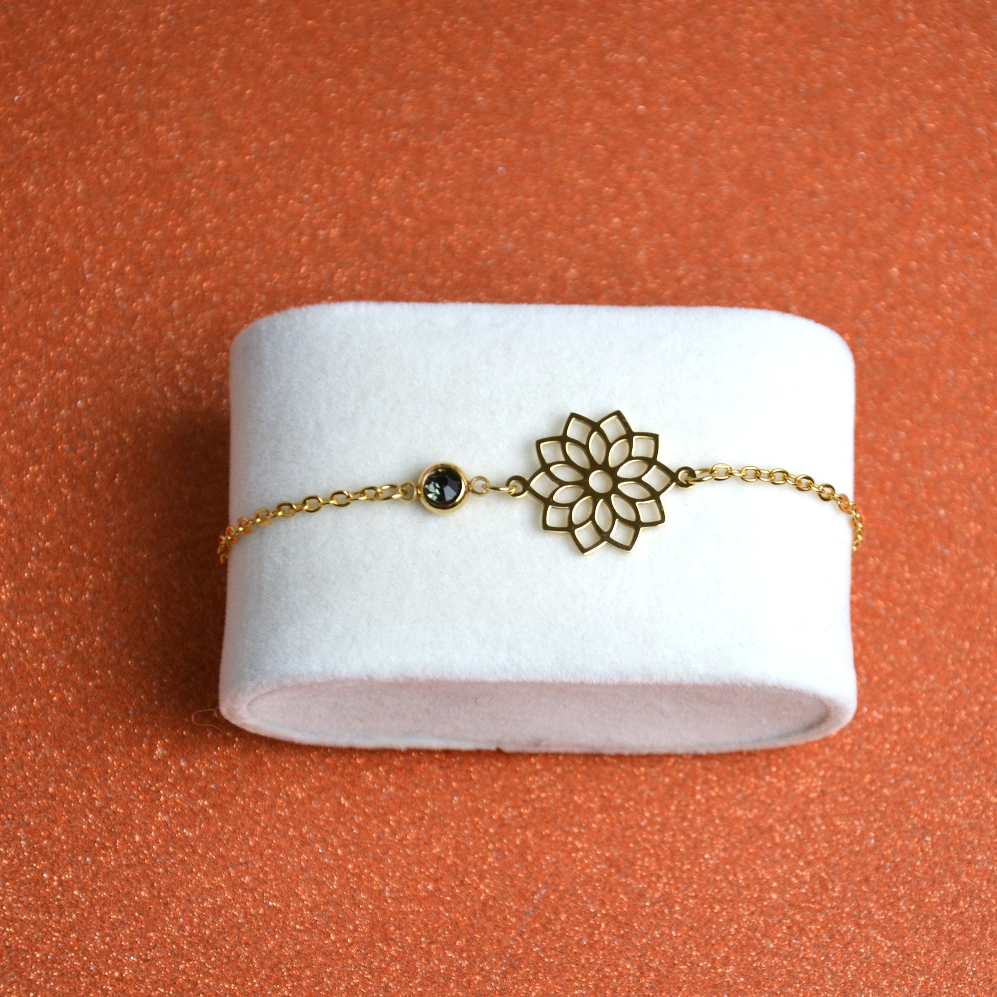 Raffiné et élégant, ce bracelet minimaliste en acier inoxydable doré apporte une touche de sophistication à votre poignet. Son pendentif en forme de rosace, finement travaillé, symbolise l'harmonie et l'équilibre, tandis que la pierre scintillante ajoute une note de brillance subtile.
